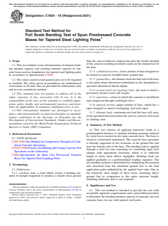 ASTM C1824-16(2021) is a standard published by ASTM International. Its full title is "Standard Test Method for Full Scale Bending Test of Spun Prestressed Concrete Bases for Tapered Steel Lighting Poles". This standard covers: SIGNIFICANCE AND USE 5.1 This test method is intended to provide the user with acceptable apparatus requirements and a prescribed procedure to determine the bending moment capacity of spun pre-stressed concrete bases for use with tapered steel poles. 5.2 The results of this test method are used as a basis for verification of calculated bending moment capacity, quality control tool for manufacturing process and as a basis for determining statistical bending moment capacity. 5.3 This test method shall not be used for full length prestressed concrete, steel, or composite poles. SCOPE 1.1 This test method covers determination of ultimate bending moment capacity and cracking moment capacity of concrete bases used as foundations for tapered steel lighting poles in accordance to Specification C1804. 1.2 The values stated in inch-pound units are to be regarded as standard. The values given in parentheses are mathematical conversions to SI units that are provided for information only and are not considered standard. 1.3 This standard does not purport to address all of the safety concerns, if any, associated with its use. It is the responsibility of the user of this standard to establish appropriate safety, health, and environmental practices and determine the applicability of regulatory limitations prior to use. 1.4 This international standard was developed in accordance with internationally recognized principles on standardization established in the Decision on Principles for the Development of International Standards, Guides and Recommendations issued by the World Trade Organization Technical Barriers to Trade (TBT) Committee.