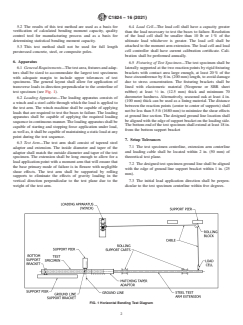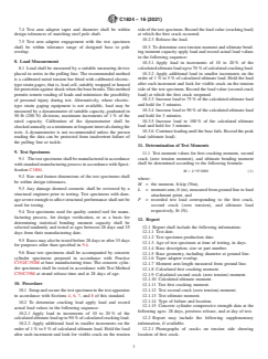 SIGNIFICANCE AND USE 5.1 This test method is intended to provide the user with acceptable apparatus requirements and a prescribed procedure to determine the bending moment capacity of spun pre-stressed concrete bases for use with tapered steel poles. 5.2 The results of this test method are used as a basis for verification of calculated bending moment capacity, quality control tool for manufacturing process and as a basis for determining statistical bending moment capacity. 5.3 This test method shall not be used for full length prestressed concrete, steel, or composite poles. SCOPE 1.1 This test method covers determination of ultimate bending moment capacity and cracking moment capacity of concrete bases used as foundations for tapered steel lighting poles in accordance to Specification C1804. 1.2 The values stated in inch-pound units are to be regarded as standard. The values given in parentheses are mathematical conversions to SI units that are provided for information only and are not considered standard. 1.3 This standard does not purport to address all of the safety concerns, if any, associated with its use. It is the responsibility of the user of this standard to establish appropriate safety, health, and environmental practices and determine the applicability of regulatory limitations prior to use. 1.4 This international standard was developed in accordance with internationally recognized principles on standardization established in the Decision on Principles for the Development of International Standards, Guides and Recommendations issued by the World Trade Organization Technical Barriers to Trade (TBT) Committee.