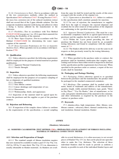ABSTRACT This specification covers the standard for high-temperature fiber blanket thermal insulation for use at various temperatures. The insulation should be tested and comply accordingly to physical and mechanical properties of the insulation such as apparent thermal conductivity, density, and temperature of use. The insulation shall also be tested for non-fibrous content, linear shrinkage, and tensile strength. SCOPE 1.1 This specification covers high-temperature fiber blanket thermal insulation for use from ambient up to 3000°F (1649°C). 1.2 When the potential exists that the installation or use of thermal insulation materials, accessories, and systems will pose safety or health problems, the manufacturers shall provide the user with appropriate current information regarding any known problems associated with the recommended use of the products, and shall also recommend protective measures to be employed in their safe utilization. The user shall establish appropriate safety and health practices and determine the applicability of regulatory requirements prior to use. 1.3 The values stated in inch-pound units are to be regarded as the standard. The values given in parentheses are mathematical conversions to SI units which are provided for information only and are not considered standard. 1.4 This standard does not purport to address all of the safety concerns, if any, associated with its use. It is the responsibility of the user of this standard to establish appropriate safety, health, and environmental practices and determine the applicability of regulatory limitations prior to use. 1.5 This international standard was developed in accordance with internationally recognized principles on standardization established in the Decision on Principles for the Development of International Standards, Guides and Recommendations issued by the World Trade Organization Technical Barriers to Trade (TBT) Committee.