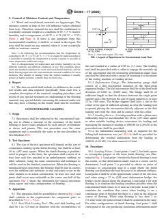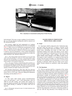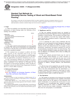 ASTM D2394-17(2022) is a standard published by ASTM International. Its full title is "Standard Test Methods for Simulated Service Testing of Wood and Wood-Based Finish Flooring". This standard covers: SIGNIFICANCE AND USE 3.1 The test methods presented herein are intended to provide both a factual and comparative means of appraising the suitability of finish flooring. The procedures developed simulate some conditions of use that may require either maintenance beyond that considered normal or replacement of the floor surface material. 3.2 It is important for some of the evaluations that the substrate to be used beneath the finish flooring be duplicated because the type and degree of support will have a direct influence on the value obtained from test. For example, in some present-day construction, low-density materials are used for sound-deadening immediately below the finish flooring. The way this substrate distributes loading and absorbs energy will have an influence on evaluations such as those in rolling and concentrated loads. 3.3 The test methods presented herein may be used to compare different finish floorings as to their resistance to severe and ordinary service loads and also may serve as the means to set specification limits. The properties obtained by these test methods are needed in addition to such basic material properties as stiffness, strength, hardness, and dimensional stability. 3.4 All tests may not be required for any specific investigation. There may be an interrelation between two tests, and when it has been demonstrated what the interrelation is, a complete evaluation is only required as a final stage of a study. In each instance, therefore, it is necessary to determine which evaluations shall be made to fulfill the objectives. SCOPE 1.1 These test methods cover procedures for measuring the performance of finish flooring under the following service loadings and conditions: Section Loading Tests Concentrated Loading 7 Floor Surface Indentation from Small Area Loads 12 Falling-Ball Indentation 18 Rolling Load 23 Mechanical Tests Abrasion Resistance 28 Coefficient of Friction 33 Moisture Tests Surface Wetting 38 1.2 The values stated in inch-pound units are to be regarded as standard. The values given in parentheses are mathematical conversions to SI units that are provided for information only and are not considered standard. 1.3 This standard does not purport to address all of the safety concerns, if any, associated with its use. It is the responsibility of the user of this standard to establish appropriate safety, health, and environmental practices and determine the applicability of regulatory limitations prior to use. 1.4 This international standard was developed in accordance with internationally recognized principles on standardization established in the Decision on Principles for the Development of International Standards, Guides and Recommendations issued by the World Trade Organization Technical Barriers to Trade (TBT) Committee.