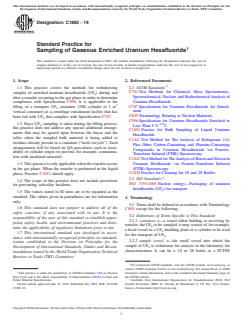 ASTM C1883-19 is a standard practice published by ASTM International for the sampling of gaseous enriched uranium hexafluoride (UF6) during and after gas-phase transfers. The standard outlines sampling procedures to ensure representative samples are obtained for quality control and compliance testing in uranium enrichment operations. This practice is essential for meeting commercial specifications, such as ASTM C996, and for supporting safe handling, transport, and regulatory compliance of UF6, a critical material in the nuclear fuel cycle.