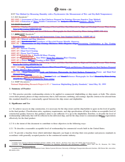 SIGNIFICANCE AND USE 4.1 To achieve success in ship construction, it is necessary for the ship owner and the ship builder to agree on the level of quality in the final product. Classification rules, regulatory requirements, and ship specifications all help to define an acceptable level of construction quality; however, this guidance alone is not sufficient. It is up to the shipbuilder, therefore, to describe the level of workmanship sufficiently that will be reflected in the delivered ship, and for the ship owner to communicate their expectations effectively for the final product. 4.2 It is the intent of this document to contribute to these objectives in the following ways: 4.2.1 To describe a reasonable acceptable level of workmanship for commercial vessels built in the United States. 4.2.2 To provide a baseline from which individual shipyards can begin to develop their own product and process standards in accordance with generally accepted practice in the commercial marine industry. 4.2.3 To provide a foundation for negotiations between the shipbuilder and the ship owner in reaching a common expectation of construction quality. 4.3 The acceptance criteria herein are based on currently practiced levels of quality generally achieved by leading international commercial shipbuilders. These criteria are not intended to be a hard standard with which all U.S. shipyards must comply. Rather, they are intended to provide guidance and recommendations in the key areas that play a major role in customer satisfaction and cost-effective ship construction. SCOPE 1.1 This practice consists of three annexes: hull structure, outfitting, and coating. The subject of these annexes was selected for several reasons. Other commercial shipbuilding nations already have in place widely recognized standards of expectations in these areas. These constitute the most significant areas where workmanship is a critical factor in customer satisfaction. The cost associated with the labor involved in these three areas is a significant factor in construction man-hours and overall schedules. 1.2 The standard criteria provided in this practice are intended to apply to conventional, commercial ship construction. In many cases, specialized, nonconventional vessels using nonstandard materials or built-to-serve sole requirements may require unique acceptance criteria that are beyond those provided in this practice. 1.3 The values stated in SI units are to be regarded as standard. No other units of measurement are included in this standard. 1.4 This international standard was developed in accordance with internationally recognized principles on standardization established in the Decision on Principles for the Development of International Standards, Guides and Recommendations issued by the World Trade Organization Technical Barriers to Trade (TBT) Committee.