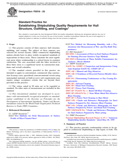 ASTM F2016-23 is a standard published by ASTM International. Its full title is "Standard Practice for Establishing Shipbuilding Quality Requirements for Hull Structure, Outfitting, and Coatings". This standard covers: SIGNIFICANCE AND USE 4.1 To achieve success in ship construction, it is necessary for the ship owner and the ship builder to agree on the level of quality in the final product. Classification rules, regulatory requirements, and ship specifications all help to define an acceptable level of construction quality; however, this guidance alone is not sufficient. It is up to the shipbuilder, therefore, to describe the level of workmanship sufficiently that will be reflected in the delivered ship, and for the ship owner to communicate their expectations effectively for the final product. 4.2 It is the intent of this document to contribute to these objectives in the following ways: 4.2.1 To describe a reasonable acceptable level of workmanship for commercial vessels built in the United States. 4.2.2 To provide a baseline from which individual shipyards can begin to develop their own product and process standards in accordance with generally accepted practice in the commercial marine industry. 4.2.3 To provide a foundation for negotiations between the shipbuilder and the ship owner in reaching a common expectation of construction quality. 4.3 The acceptance criteria herein are based on currently practiced levels of quality generally achieved by leading international commercial shipbuilders. These criteria are not intended to be a hard standard with which all U.S. shipyards must comply. Rather, they are intended to provide guidance and recommendations in the key areas that play a major role in customer satisfaction and cost-effective ship construction. SCOPE 1.1 This practice consists of three annexes: hull structure, outfitting, and coating. The subject of these annexes was selected for several reasons. Other commercial shipbuilding nations already have in place widely recognized standards of expectations in these areas. These constitute the most significant areas where workmanship is a critical factor in customer satisfaction. The cost associated with the labor involved in these three areas is a significant factor in construction man-hours and overall schedules. 1.2 The standard criteria provided in this practice are intended to apply to conventional, commercial ship construction. In many cases, specialized, nonconventional vessels using nonstandard materials or built-to-serve sole requirements may require unique acceptance criteria that are beyond those provided in this practice. 1.3 The values stated in SI units are to be regarded as standard. No other units of measurement are included in this standard. 1.4 This international standard was developed in accordance with internationally recognized principles on standardization established in the Decision on Principles for the Development of International Standards, Guides and Recommendations issued by the World Trade Organization Technical Barriers to Trade (TBT) Committee.