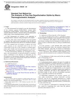 ASTM D8339-20 is a standard published by ASTM International. Its full title is "Standard Test Method for The Analysis of Flue Gas Desulfurization Solids by Macro Thermogravimetric Analysis". This standard covers: SIGNIFICANCE AND USE 5.1 Free Moisture, as determined by this instrumental test method, is used for calculating other analytical results to a dry basis using procedures in Practice D3180. 5.2 Gypsum is the primary product used to assess the quality of the FGD-Solids for industrial purposes, especially construction wallboard. FGD solids are also used in mining applications, cement manufacturing, and for agricultural purposes. 5.3 Calcium Sulfite Hemihydrate is used to assess the suitability of some FGD-Solids for industrial uses. SCOPE 1.1 This instrumental test method covers the determination of free moisture, gypsum (CaSO4•2H2O), calcium sulfite hemihydrate (CaSO3•1/2H2O), calcium hydroxide (Ca(OH)2), calcium carbonate (CaCO3), and ash in flue gas desulfurization solids using a macro thermogravimetric analyzer. 1.2 This instrumental test method is not applicable to thermogravimetric analyzers using microgram size samples. 1.3 Units—The values stated in SI units are to be regarded as standard. The values given in parentheses after SI units are provided for information only and are not considered standard. 1.4 This standard does not purport to address all of the safety concerns, if any, associated with its use. It is the responsibility of the user of this standard to establish appropriate safety, health, and environmental practices and determine the applicability of regulatory limitations prior to use. 1.5 This international standard was developed in accordance with internationally recognized principles on standardization established in the Decision on Principles for the Development of International Standards, Guides and Recommendations issued by the World Trade Organization Technical Barriers to Trade (TBT) Committee.