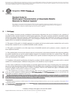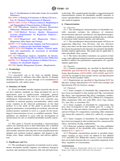 SIGNIFICANCE AND USE 5.1 The metallurgical properties of materials used to manufacture absorbable metallic implants can influence biological reactions and mechanical interaction with soft and hard tissue in the body. This standard guide describes a suggested material characterization scheme for absorbable metallic materials to ensure reproducibility of properties prior to their manufacture into medical implants. SCOPE 1.1 This guidance document provides metallurgical characterization information that may be beneficial in the evaluation of absorbable metallic materials intended for medical implant applications. This guide is primarily intended for absorbable metallic materials that undergo further processing into a fabricated final device. Therefore, this standard does not require assessments that are more appropriately conducted on the final device, such as biological evaluation. However, a few relevant standards for finished implant devices are included for information purposes. 1.2 The purpose of this guide is to identify appropriate test methods and relevant medical product standards that can be used to develop future standards for new or modified absorbable metallic materials. 1.3 This guide is not intended to cover other major classes of absorbable materials such as polymers, ceramics, composites, and tissue-engineered materials. 1.4 This standard guide is focused on the chemical, physical, microstructural, and mechanical properties plus inspection guidelines for metallic materials that are used for medical implants designed to be absorbed in the body over a period of time. This guide focuses on material characterizations and does not address device specific mechanical testing that may be necessary to determine safety and functionality of the implant. 1.5 Compliance with materials specifications developed in accordance with this standard may not necessarily result in a material suitable for its intended purpose. Additional testing specific to the intended use may be required. 1.6 Since surface modifications of medical implants are generally applied in the latter stages of manufacturing, this standard guide does not cover the characterization of either absorbable or non-absorbable surface coatings that are metallic in origin such as oxides or from the addition of other materials such as ceramics or polymers. However, this standard does apply to absorbable metallic materials, regardless of the presence or absence of a coating. 1.7 This standard does not purport to address all of the safety concerns, if any, associated with its use. It is the responsibility of the user of this standard to establish appropriate safety, health, and environmental practices and determine the applicability of regulatory limitations prior to use. 1.8 This international standard was developed in accordance with internationally recognized principles on standardization established in the Decision on Principles for the Development of International Standards, Guides and Recommendations issued by the World Trade Organization Technical Barriers to Trade (TBT) Committee.