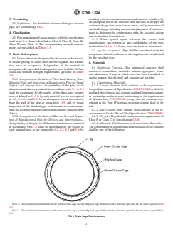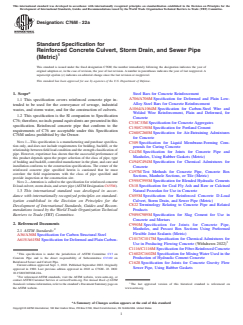 ASTM C76M-22a is a technical specification published by ASTM International. Its full title is "Standard Specification for Reinforced Concrete Culvert, Storm Drain, and Sewer Pipe (Metric)". This standard covers: ABSTRACT This specification covers reinforced concrete culvert, storm drain, and sewer pipe. The pipe manufactured with this specification shall be of five classes: Class I, Class II, Class III, Class IV, and Class V. The strength requirements for each class are specified. The reinforced concrete shall consists of: cementitious materials, mineral aggregates, and water. Cementitious materials are the following: cement, ground granulated blast-furnace slag, fly ash, and allowable combinations of cementitious materials. Other materials include: admixtures and blends, steel reinforcement, and synthetic fibers. Design tables and modified of special designs are given. Reinforcements are the following: circumferential reinforcement, longitudinal reinforcement, and joint reinforcement for rubber and non-rubber gasket joints. The physical properties shall conform to the required test for external load crushing strength. The following concrete tests shall be done: compression testing of cylinders, compression testing of cores, absorption test, and equipment test. SCOPE 1.1 This specification covers reinforced concrete pipe intended to be used for the conveyance of sewage, industrial wastes, and storm water, and for the construction of culverts. 1.2 This specification is the SI companion to Specification C76; therefore, no inch-pound equivalents are presented in this specification. Reinforced concrete pipe that conform to the requirements of C76 are acceptable under this Specification C76M unless prohibited by the Owner. Note 1: This specification is a manufacturing and purchase specification only, and does not include requirements for bedding, backfill, or the relationship between field load condition and the strength classification of pipe. However, experience has shown that the successful performance of this product depends upon the proper selection of the class of pipe, type of bedding and backfill, controlled manufacture in the plant, and care and installation conforms to the construction specifications. The owner of the reinforced concrete pipe specified herein is cautioned that he must correlate the field requirements with the class of pipe specified and provide inspection at the construction site. Note 2: Attention is called to the specification for reinforced concrete D-load culvert, storm drain, and sewer pipe (ASTM Designation C655M). 1.3 This international standard was developed in accordance with internationally recognized principles on standardization established in the Decision on Principles for the Development of International Standards, Guides and Recommendations issued by the World Trade Organization Technical Barriers to Trade (TBT) Committee.