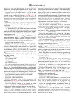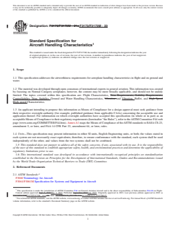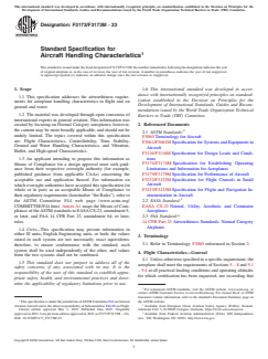 ABSTRACT This specification covers airworthiness design criteria for aeroplane handling characteristics in flight and on ground and water. The applicant for a design approval shall seek the individual guidance of their respective civil aviation authority (CAA) body concerning the use of this specification as part of a certification plan. SCOPE 1.1 This specification addresses the airworthiness requirements for aeroplane handling characteristics in flight and on ground and water. 1.2 The material was developed through open consensus of international experts in general aviation. This information was created by focusing on Normal Category aeroplanes; however, the content may be more broadly applicable, and should not be unduly limited. The topics covered within this specification are: Flight Characteristics, Controllability, Trim, Stability, Ground and Water Handling Characteristics, and Vibration, Buffet, and High-speed Characteristics. 1.3 An applicant intending to propose this information as Means of Compliance for a design approval must seek guidance from their respective oversight authority (for example, published guidance from applicable CAAs) concerning the acceptable use and application thereof. For information on which oversight authorities have accepted this specification (in whole or in part) as an acceptable Means of Compliance to their regulatory requirements (hereinafter “the Rules”), refer to the ASTM Committee F44 web page (www.astm.org/COMMITTEE/F44.htm). Annex A1 maps the Means of Compliance of the ASTM standards to EASA CS-23, amendment 5, or later, and FAA 14 CFR Part 23, amendment 64, or later, rules. 1.4 Units—This specification may present information in either SI units, English Engineering units, or both; the values stated in each system are not necessarily exact equivalents; therefore, to ensure conformance with the standard, each system shall be used independently of the other, and values from the two systems shall not be combined. 1.5 This standard does not purport to address all of the safety concerns, if any, associated with its use. It is the responsibility of the user of this standard to establish appropriate safety, health, and environmental practices and determine the applicability of regulatory limitations prior to use. 1.6 This international standard was developed in accordance with internationally recognized principles on standardization established in the Decision on Principles for the Development of International Standards, Guides and Recommendations issued by the World Trade Organization Technical Barriers to Trade (TBT) Committee.