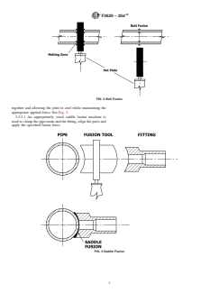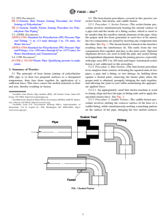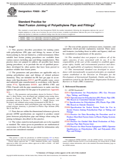SIGNIFICANCE AND USE 4.1 The procedures described in Sections 7 – 9 are primarily intended for (but not limited to) field joining of polyethylene (PE) pipe and fittings, using suitable equipment and appropriate environmental control procedures. When properly implemented, strong pressure/leak-tight joints are produced. When these joints are destructively tested, the failure occurs outside the fusion joined area. 4.2 Melt characteristics, average molecular weight and molecular weight distribution are influential factors in establishing suitable fusion parameters; therefore, consider the manufacturer’s instructions in the use or development of a specific fusion procedure. See Annex A1. 4.3 The socket fusion, butt fusion, and saddle fusion procedures in this practice are suitable for joining PE gas pipe and fittings, PE water pipe and fittings, and PE general purpose pipes and fittings made to PE product specifications from organizations such as ASTM, AWWA, API, and ISO that are used in pressure, low pressure and non-pressure applications. For gas applications, qualification of the procedure by testing joints made using the procedure in accordance with regulations from the authority having jurisdiction are required. SCOPE 1.1 This practice describes procedures for making joints with polyethylene (PE) pipe and fittings by means of heat fusion joining in, but not limited to, a field environment. Other suitable heat fusion joining procedures are available from various sources including pipe and fitting manufacturers. This practice does not purport to address all possible heat fusion joining procedures, or to preclude the use of qualified procedures developed by other parties that have been proved to produce reliable heat fusion joints. 1.2 The parameters and procedures are applicable only to joining polyethylene pipe and fittings of related polymer chemistry. They are intended for PE fuel gas pipe in accordance with Specification D2513 and PE potable water, sewer and industrial pipe manufactured in accordance with Specification F714, Specification D3035, and AWWA C901 and C906. Consult with the pipe manufacturers to make sure they approve this procedure for the pipe to be joined (see Appendix X1). Note 1: The parameters and procedures shown for Section 8. Procedure 2—Butt Fusion, were developed and validated using testing documented in Plastic Pipe Institute (PPI) TR-33. The parameters and procedures shown in Section 9. Procedure 3— Saddle Fusion, were developed and validated using testing documented in PPI TR-41. Note 2: Information about polyethylene pipe and fittings that have related polymer chemistry is presented in Plastics Pipe Institute (PPI) TR-33 and TR-41. 1.3 Parts that are within the dimensional tolerances given in present ASTM specifications are required to produce sound joints between polyethylene pipe and fittings when using the joining techniques described in this practice. 1.4 The values stated in inch-pound units are to be regarded as standard. The values given in parentheses are mathematical conversions to SI units that are provided for information only and are not considered standard. 1.5 The text of this practice references notes, footnotes, and appendixes which provide explanatory material. These notes and footnotes (excluding those in tables and figures) shall not be considered as requirements of the practice. 1.6 This standard does not purport to address all of the safety concerns, if any, associated with its use. It is the responsibility of the user of this standard to establish appropriate safety, health, and environmental practices and determine the applicability of regulatory limitations prior to use. 1.7 This international standard was developed in accordance with internationally recognized principles on standardization established in the Decision on Principles for the Development of International Standards, Guides and Recommendations issued by the World Trade O...