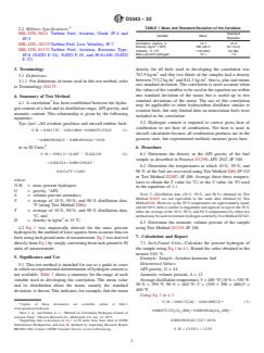 5.1 This test method is intended for use as a guide in cases in which an experimental determination of hydrogen content is not available. Table 1 shows a summary for the range of each variable used in developing the correlation. The mean value and its distribution about the mean, namely the standard deviation, is shown. This indicates, for example, that the mean density for all fuels used in developing the correlation was 783.5 kg/m3 and that two thirds of the samples had a density between 733.2 kg/m3 and 841.3 kg/m3, that is, plus and minus one standard deviation. The correlation is most accurate when the values of the variables to be used in the equation are within one standard deviation of the mean, but is useful up to two standard deviations of the mean. The use of this correlation may be applicable to other hydrocarbon distillates similar to aviation fuels, but only limited data on nonaviation fuels were included in the correlation.