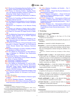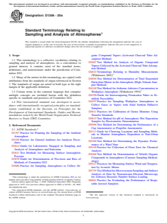 ASTM D1356-20a is a standard published by ASTM International. Its full title is "Standard Terminology Relating to Sampling and Analysis of Atmospheres". This standard covers: SCOPE 1.1 This terminology is a collective vocabulary relating to sampling and analysis of atmospheres. As a convenience to general interest, it contains most of the standard terms, definitions, and nomenclature under the jurisdiction of Committee D22. 1.2 Many of the entries in this terminology are copied (with attribution) from the standards of origin referenced in Section 2. The standards of origin are noted in bold type at the right margin of the applicable definition. 1.3 Certain terms in the common language that comprise multiple concepts are included herein with the definition specific to standards and practices of Committee D22. 1.4 This international standard was developed in accordance with internationally recognized principles on standardization established in the Decision on Principles for the Development of International Standards, Guides and Recommendations issued by the World Trade Organization Technical Barriers to Trade (TBT) Committee.