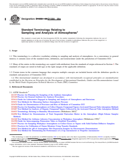 SCOPE 1.1 This terminology is a collective vocabulary relating to sampling and analysis of atmospheres. As a convenience to general interest, it contains most of the standard terms, definitions, and nomenclature under the jurisdiction of Committee D22. 1.2 Many of the entries in this terminology are copied (with attribution) from the standards of origin referenced in Section 2. The standards of origin are noted in bold type at the right margin of the applicable definition. 1.3 Certain terms in the common language that comprise multiple concepts are included herein with the definition specific to standards and practices of Committee D22. 1.4 This international standard was developed in accordance with internationally recognized principles on standardization established in the Decision on Principles for the Development of International Standards, Guides and Recommendations issued by the World Trade Organization Technical Barriers to Trade (TBT) Committee.