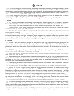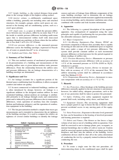 SIGNIFICANCE AND USE 5.1 Air leakage accounts for a significant portion of the thermal space conditioning load. In addition, it affects occupant comfort and indoor air quality. 5.2 In most commercial or industrial buildings, outdoor air is often introduced by design; however, air leakage is a significant addition to the designed outdoor airflow. In most residential buildings, indoor-outdoor air exchange is attributable primarily to air leakage through cracks and construction joints and is induced by pressure differences due to temperature differences, wind, operation of auxiliary fans (for example, kitchen and bathroom exhausts), and the operation of combustion equipment in the building. 5.3 The fan-pressurization method is simpler than tracer gas measurements and is intended to characterize the air tightness of the building envelope. It is used to compare the relative air tightness of several similar buildings to identify the leakage sources and rates of leakage from different components of the same building envelope, and to determine the air leakage reduction for individual retrofit measures applied incrementally to an existing building, and to determine ventilation rates when combined with weather and leak location information. SCOPE 1.1 This test method measures air-leakage rates through a building envelope under controlled pressurization and de-pressurization. 1.2 This test method is applicable to small temperature differentials and low-wind pressure differential, therefore strong winds and large indoor-outdoor temperature differentials shall be avoided. 1.3 This test method is intended to quantify the air tightness of a building envelope. This test method does not measure air change rate or air leakage rate under normal weather conditions and building operation. Note 1: See Test Method E741 to directly measure air-change rates using the tracer gas dilution method. 1.4 This test method is intended to be used for measuring the air tightness of building envelopes of single-zone buildings. For the purpose of this test method, many multi-zone buildings can be treated as single-zone buildings by opening interior doors or by inducing equal pressures in adjacent zones. 1.5 Only metric SI units of measurement are used in this standard. If a value for measurement is followed by a value in other units in parentheses, the second value may be approximate. The first stated value is the requirement. 1.6 This standard does not purport to address all of the safety concerns, if any, associated with its use. It is the responsibility of the user of this standard to establish appropriate safety, health, and environmental practices and determine the applicability of regulatory limitations prior to use. For specific hazard statements see Section 7. 1.7 This international standard was developed in accordance with internationally recognized principles on standardization established in the Decision on Principles for the Development of International Standards, Guides and Recommendations issued by the World Trade Organization Technical Barriers to Trade (TBT) Committee.
