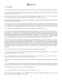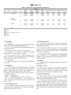 ABSTRACT This classification system covers polychlorotrifluoroethylene (PCTFE) plastics that consist of at least 90% chlorotrifluoroethylene and are suitable for extrusion and for compression and injection molding. The remaining 10% may include chemical modifications, such as co-monomers, but not colorants, fillers, plasticizers, or mechanical blends with other resins. PCTFE materials in powders and pellets are classified into one group. The group is subdivided into classes based on chemical composition: Class 1; Class 2; and Class 3. These classes are subdivided into grades: Grades 1, 2, 3, and 0; Grades 1, 2, and 0; and Grades 1, 2, and 0; respectively. The molding or extrusion material shall be of uniform composition and so compounded as to conform to the requirements of this classification system. The properties shall be determined in accordance with the following test methods: conditioning; zero strength time; test conditions; deformation under load; melting point; dissipation factor and dielectric constant; and specific gravity. SCOPE 1.1 This classification system covers polychlorotrifluoroethylene (PCTFE) plastics that consist of at least 90 % chlorotrifluoroethylene and are suitable for extrusion and for compression and injection molding. Additional components allow for chemical modifications, such as co-monomers, but not colorants, fillers, plasticizers, or mechanical blends with other resins. This classification system does not cover recycled PCTFE materials. 1.2 The physical and electrical properties of parts molded or extruded from PCTFE molding compounds vary with the crystalline content obtained during processing and subsequent annealing. Accordingly, the numerical values listed in Table 1 apply only to the test specimens molded in accordance with Section 8. These values are not applicable as design criteria to semi-finished and finished parts prepared and annealed under other conditions. 1.3 The values stated in SI units as detailed in IEEE/SI-10 are to be regarded as the standard. The values given in parentheses are for information only. 1.4 The following precautionary statement pertains only to the test methods portion, Section 10, of this classification system: This standard does not purport to address all of the safety concerns, if any, associated with its use. It is the responsibility of the user of this standard to establish appropriate safety, health, and environmental practices and determine the applicability of regulatory limitations prior to use. Note 1: Although this classification system and ISO 20568-1 and ISO 20568-2 differ in approach or detail, data obtained using either are technically equivalent. 1.5 This international standard was developed in accordance with internationally recognized principles on standardization established in the Decision on Principles for the Development of International Standards, Guides and Recommendations issued by the World Trade Organization Technical Barriers to Trade (TBT) Committee.
