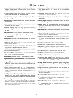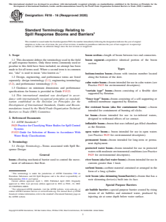 SCOPE 1.1 This document defines the terminology used in the field of spill response barriers. Only those terms commonly used or peculiar to this field have been included; no attempt has been made to list all terms used. Where a second term is in common use, “aka” is used to mean “also known as.” 1.2 Design, engineering, and performance terms are listed separately: design terminology (3.1), engineering terminology (3.2), and performance terminology (3.3). 1.3 Guidance on minimum dimensions and performance specifications for booms is provided in Guide F1523. 1.4 This international standard was developed in accordance with internationally recognized principles on standardization established in the Decision on Principles for the Development of International Standards, Guides and Recommendations issued by the World Trade Organization Technical Barriers to Trade (TBT) Committee.