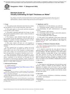 ASTM F2534-17(2022) is a guide published by ASTM International. Its full title is "Standard Guide for Visually Estimating Oil Spill Thickness on Water". This standard covers: SIGNIFICANCE AND USE 3.1 Estimations of oil slick thickness are useful for: 3.1.1 Estimating amount (volume) of oil in an area, 3.1.2 Positioning oil spill countermeasures in optimal locations, 3.1.3 Evaluating a spill situation, 3.1.4 Estimating volume for legal or prosecution purposes, such as for an illegal discharge, and 3.1.5 Developing spill control strategies. 3.2 This guide is only applicable to thin sheens (sheen and rainbow sheen up to about 3 μm). Thick oil and water-in-oil emulsions do not show visual differences with respect to thickness (1, 2).3 SCOPE 1.1 This guide provides information and criteria for estimating the thickness of oil on water using only visual clues. 1.2 This guide applies to oil-on-water and does not pertain to oil on land or other surfaces. 1.3 This guide is generally applicable for all types of crude oils and most petroleum products, under a variety of marine or fresh water conditions. 1.4 The thickness values obtained using this guide are at best estimates because the appearance of oil on water may be affected by a number of factors including oil type, sea state, visibility conditions, view angle, and weather. 1.5 The values stated in SI units are to be regarded as standard. No other units of measurement are included in this standard. 1.6 This standard does not purport to address all of the safety concerns, if any, associated with its use. It is the responsibility of the user of this standard to establish appropriate safety, health, and environmental practices and determine the applicability of regulatory limitations prior to use. 1.7 This international standard was developed in accordance with internationally recognized principles on standardization established in the Decision on Principles for the Development of International Standards, Guides and Recommendations issued by the World Trade Organization Technical Barriers to Trade (TBT) Committee.