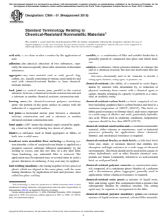 ASTM C904-01(2018): Standard Terminology Relating to Chemical-Resistant Nonmetallic Materials establishes a comprehensive set of definitions for terms commonly encountered in the field of chemical-resistant nonmetallic materials. Developed by ASTM International, this terminology standard is crucial for professionals and organizations involved in the specification, manufacture, testing, and application of materials designed to withstand aggressive chemical environments. By standardizing language, ASTM C904-01(2018) enhances clarity and ensures consistent communication in industries such as chemical processing, construction, and protective coatings.