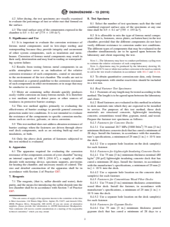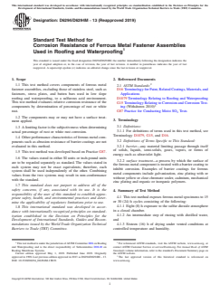 SIGNIFICANCE AND USE 5.1 It is important to evaluate the corrosion resistance of ferrous metal components used in low-slope roofing and waterproofing because they provide integrity and securement of other system components, such as insulation and membranes. Corrosion of ferrous metal components may result in their early deterioration and may lead to roofing or waterproofing system failure. 5.2 Results from testing ferrous metal components in an acidic atmosphere serve as an indication of the relative corrosion resistance of such components, coated or uncoated, to the environment of the test chamber. The results are not to be construed as a general guideline to the corrosion resistance of such components in other environments or in usage that may be conducive to corrosion. 5.3 Moist air containing sulfur dioxide quickly produces easily visible corrosion on many ferrous metals. It is therefore a test medium suited to detect pores or other sources of weakness in protective barrier coatings. 5.4 This test method applies primarily to evaluating the effectiveness of barrier coatings to provide general corrosion protection under test conditions. It is not intended to evaluate the resistance of the components to specific corrosion mechanisms such as crevice, galvanic, or stress corrosion. 5.5 This test method does not address abrasion resistance of barrier coatings when the fasteners are driven through above roof deck components, such as an existing built-up roof or insulations, or both. 5.6 Only the above deck portion of fasteners subjected to this test method is evaluated. SCOPE 1.1 This test method covers components of ferrous metal fastener assemblies, excluding those of stainless steel, such as fasteners, stress plates, and batten bars used in low slope roofing and waterproofing, to a sulfurous acid environment. This test method evaluates relative corrosion resistance of the components by determination of percentage of rust or white rust. 1.2 The components may or may not have a surface treatment applied. 1.3 A limiting factor is the subjectiveness when determining actual percentage of rust or white rust corrosion. 1.4 Other performance characteristics of ferrous metal components such as abrasion resistance of barrier coatings are not evaluated in this method. 1.5 This test method was developed based on Practice G87. 1.6 The values stated in either SI units or inch-pound units are to be regarded separately as standard. The values stated in each system may not be exact equivalents; therefore, each system shall be used independently of the other. Combining values from the two systems may result in non-conformance with the standard. 1.7 This standard does not purport to address all of the safety concerns, if any, associated with its use. It is the responsibility of the user of this standard to establish appropriate safety, health, and environmental practices and determine the applicability of regulatory limitations prior to use. 1.8 This international standard was developed in accordance with internationally recognized principles on standardization established in the Decision on Principles for the Development of International Standards, Guides and Recommendations issued by the World Trade Organization Technical Barriers to Trade (TBT) Committee.