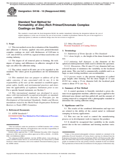 ASTM D4146-10(2022) is a standard published by ASTM International. Its full title is "Standard Test Method for Formability of Zinc-Rich Primer/Chromate Complex Coatings on Steel". This standard covers: SIGNIFICANCE AND USE 5.1 The results of the combined deformation and tape test are related to the ability of the coated metal to withstand stamping in factory applications. 5.2 This test can be used to control the manufacturing process or in development work to improve the product. 5.3 It should be recognized that variability in the results persist due to the test conditions and forming machine variations. SCOPE 1.1 This test method covers the evaluation of the formability and adhesion of factory applied zinc-rich primer/chromate complex coatings on steel with thicknesses of 0.65 mm to 1.25 mm (0.025 in. to 0.05 in.) typical of those used in the coil coating industry. 1.2 The degree of oil removal prior to forming, the techniques of taping, and differences in adhesive strength of the tape can affect the adhesion rating. 1.3 The values stated in SI units are to be regarded as the standard. The values given in parentheses are for information only. 1.4 This standard does not purport to address all of the safety concerns, if any, associated with its use. It is the responsibility of the user of this standard to establish appropriate safety, health, and environmental practices and determine the applicability of regulatory limitations prior to use. For a specific hazard statement, see Section 7. 1.5 This international standard was developed in accordance with internationally recognized principles on standardization established in the Decision on Principles for the Development of International Standards, Guides and Recommendations issued by the World Trade Organization Technical Barriers to Trade (TBT) Committee.