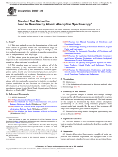ASTM D3237-22, "Standard Test Method for Lead in Gasoline by Atomic Absorption Spectroscopy," is a key international standard developed by ASTM for the determination of total lead content in gasoline. This test method provides a reliable procedure for accurately measuring trace levels of lead in gasoline samples, ensuring they meet regulatory requirements such as those mandated for lead-free gasoline in the United States (40 CFR part 80). The standard outlines a precise approach using atomic absorption spectroscopy (AAS), making it an essential reference for laboratories, petroleum refineries, and regulatory agencies involved in fuel quality control and environmental compliance.