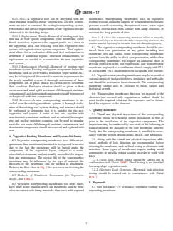 SIGNIFICANCE AND USE 4.1 This guide provides the general information, procedures, and guidelines for the selection of the waterproofing membrane to create a waterproofing system for a Vegetative (Green) roof. 4.2 This guide is not all inclusive; this guide is intended to supplement detailed instructions from manufacturers, ASTM Standards, and building code requirements. SCOPE 1.1 The purpose of this guide is to provide guidance in the selection of a suitable waterproofing membrane within a vegetative roof system. The guide offers various options for reviewing the membrane installation during and upon completion of the installation and prior to the vegetative components being installed. This guide applies to membranes that do or do not require UV protection. For the purpose of this guide, the supporting structure and roof deck are assumed to be mechanically and structurally sound and will accept the weight of the vegetative roof system including the membrane, insulation, and other roofing/waterproofing components including all components related to the vegetative layers as well as the required design loads. Slope to drain at the membrane level is preferred and should be included where possible. Providing a replacement or a re-cover vegetative roofing system on an existing building may require that the support structure be reinforced so that it can safely support the additional weight of the vegetative roof system and also provide the minimum live load capacity required by the building code. 1.2 Design criteria associated with the vegetative portions of the system are beyond the scope of this guide. Please refer to Guide E2777. 1.3 This standard does not purport to address all of the safety concerns, if any, associated with its use. It is the responsibility of the user of this standard to establish appropriate safety and health practices and determine the applicability of regulatory limitations prior to use. 1.4 This international standard was developed in accordance with internationally recognized principles on standardization established in the Decision on Principles for the Development of International Standards, Guides and Recommendations issued by the World Trade Organization Technical Barriers to Trade (TBT) Committee.