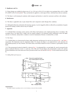 SIGNIFICANCE AND USE 5.1 Flume designs are available for throat sizes of 1 in. (2.54 cm) to 50 ft (15.2 m) which cover maximum flows of 0.2 to 3000 ft3/s (0.0057 to 85 m3/s) (1) and (2).4 They can therefore be applied to a wide range of flows, with head losses that are moderate. 5.2 The flume is self-cleansing for moderate solids transport and therefore is suited for wastewater and flows with sediment. SCOPE 1.1 This test method covers measurement of the volumetric flowrate of water and wastewater in open channels with the Parshall flume. 1.1.1 Information related to this test method can be found in ISO 1438 and ISO 4359. 1.2 The values stated in inch-pound units are to be regarded as standard. The values given in parentheses are mathematical conversions to SI units that are provided for information only and are not considered standard. 1.3 This standard does not purport to address all of the safety concerns, if any, associated with its use. It is the responsibility of the user of this standard to establish appropriate safety, health, and environmental practices and determine the applicability of regulatory limitations prior to use. 1.4 This international standard was developed in accordance with internationally recognized principles on standardization established in the Decision on Principles for the Development of International Standards, Guides and Recommendations issued by the World Trade Organization Technical Barriers to Trade (TBT) Committee.