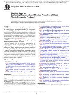 ASTM D7031-11(2019) is a guide published by ASTM International. Its full title is "Standard Guide for Evaluating Mechanical and Physical Properties of Wood-Plastic Composite Products". This standard covers: SIGNIFICANCE AND USE 4.1 WPCs are intended for use in both structural and non-structural applications. The test methods described within are intended to address products that are manufactured from virgin or recycled wood and thermoplastic sources. These methods provide a reference for the evaluation of several mechanical and physical properties important for structural and non-structural uses of WPCs. SCOPE 1.1 This guide covers test methods appropriate for evaluating a wide range of performance properties for wood-plastic composite (WPC) products. It was developed from evaluations of both experimental and currently manufactured products, and is not intended to suggest that all the tests listed are necessary or appropriate for each application of a WPC. The user must determine which test methods apply to the particular application being evaluated (see Appendix X1). 1.2 Details of manufacturing processes may be proprietary and are beyond the scope of this guide. 1.3 This standard does not purport to address all of the safety concerns, if any, associated with its use. It is the responsibility of the user of this standard to establish appropriate safety, health, and environmental practices and determine the applicability of regulatory limitations prior to use. 1.4 This international standard was developed in accordance with internationally recognized principles on standardization established in the Decision on Principles for the Development of International Standards, Guides and Recommendations issued by the World Trade Organization Technical Barriers to Trade (TBT) Committee.