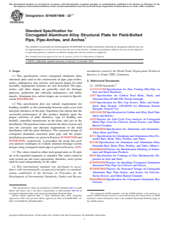 ABSTRACT This specification covers corrugated aluminum alloy structural plate used in the construction of pipe, pipe-arches, arches, underpasses, box culverts, and special shapes for field assembly. The pipe, arches, and other shapes are generally used for drainage purposes, pedestrian and vehicular underpasses, and utility tunnels. Structural plates shall be fabricated from flat sheets or plates, corrugated, punched for bolted lap seams and curved to the required radius. SCOPE 1.1 This specification covers corrugated aluminum alloy structural plate used in the construction of pipe, pipe-arches, arches, underpasses, box culverts, and special shapes for field assembly. Appropriate fasteners are also described. The pipe, arches, and other shapes are generally used for drainage purposes, pedestrian and vehicular underpasses, and utility tunnels. Aluminum box culvert shapes are covered in Specification B864/B864M. 1.2 This specification does not include requirements for bedding, backfill, or the relationship between earth cover load and plate thickness of the pipe. Experience has shown that the successful performance of this product depends upon the proper selection of plate thickness, type of bedding and backfill, controlled manufacture in the plant, and care in the installation. The purchaser must correlate the above factors and also the corrosion and abrasion requirements of the field installation with the plate thickness. The structural design of corrugated aluminum structural plate pipe and the proper installation procedures are given in Practices B790/B790M and B789/B789M, respectively. A procedure for using life-cycle cost analysis techniques to evaluate alternate drainage system designs using corrugated metal pipe is given in Practice A930. 1.3 The values stated in either inch-pound units or SI units are to be regarded separately as standard. The values stated in each system are not exact equivalents; therefore, each system shall be used independently of the other. 1.4 This international standard was developed in accordance with internationally recognized principles on standardization established in the Decision on Principles for the Development of International Standards, Guides and Recommendations issued by the World Trade Organization Technical Barriers to Trade (TBT) Committee.