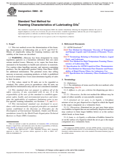 SIGNIFICANCE AND USE 5.1 The tendency of oils to foam can be a serious problem in systems such as high-speed gearing, high-volume pumping, and splash lubrication. Inadequate lubrication, cavitation, and overflow loss of lubricant can lead to mechanical failure. This test method is used in the evaluation of oils for such operating conditions. SCOPE 1.1 This test method covers the determination of the foaming characteristics of lubricating oils at 24 °C and 93.5 °C. Means of empirically rating the foaming tendency and the stability of the foam are described. 1.2 WARNING—Mercury has been designated by many regulatory agencies as a hazardous substance that can cause serious medical issues. Mercury, or its vapor, has been demonstrated to be hazardous to health and corrosive to materials. Use caution when handling mercury and mercury-containing products. See the applicable product Safety Data Sheet (SDS) for additional information. The potential exists that selling mercury or mercury-containing products, or both, is prohibited by local or national law. Users must determine legality of sales in their location. 1.3 The values stated in SI units are to be regarded as standard. The values given in parentheses after SI units are provided for information only and are not considered standard. 1.4 This standard does not purport to address all of the safety concerns, if any, associated with its use. It is the responsibility of the user of this standard to establish appropriate safety, health, and environmental practices and determine the applicability of regulatory limitations prior to use. For specific warning statements, see Sections 7, 8, and 9.1.1. 1.5 This international standard was developed in accordance with internationally recognized principles on standardization established in the Decision on Principles for the Development of International Standards, Guides and Recommendations issued by the World Trade Organization Technical Barriers to Trade (TBT) Committee.