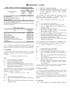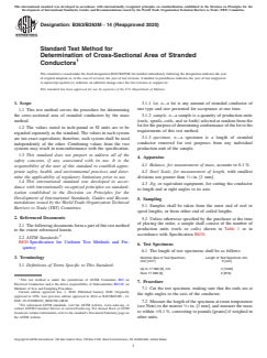 ABSTRACT This test method covers the standard procedure for determining the cross-sectional area of stranded conductors by the mass method. The apparatus shall consist of a balance for mass measurement, a steel scale for length measurement, and a jig or equivalent equipment for cutting the conductor to length and at right angles to its axis. Cross-sectional area of stranded conductors such as those with only one type of conducting material, cored annular conductors and steel-reinforced aluminum conductors, composite copper and copper-covered steel conductors, and composite aluminum 1350 and aluminum alloy 6201 conductor shall be calculated. SCOPE 1.1 This test method covers the procedure for determining the cross-sectional area of stranded conductors by the mass method. 1.2 The values stated in inch-pound or SI units are to be regarded separately as the standard. The values in each system are not exact equivalents; therefore, each system shall be used independently of the other. Combining values from the two systems may result in nonconformance with the specification. 1.3 This standard does not purport to address all of the safety concerns, if any, associated with its use. It is the responsibility of the user of this standard to establish appropriate safety, health, and environmental practices and determine the applicability of regulatory limitations prior to use. 1.4 This international standard was developed in accordance with internationally recognized principles on standardization established in the Decision on Principles for the Development of International Standards, Guides and Recommendations issued by the World Trade Organization Technical Barriers to Trade (TBT) Committee.