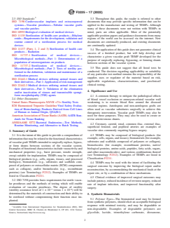ASTM F3225-17(2022) is a guide published by ASTM International. Its full title is "Standard Guide for Characterization and Assessment of Vascular Graft Tissue Engineered Medical Products (TEMPs)". This standard covers: SIGNIFICANCE AND USE 4.1 A common therapy to mitigate the pathological effects of blood vessel occlusion or aneurysm-related vascular wall weakening is to reroute blood flow around the diseased vascular regions. Autologous and non-autologous grafts are often used as vascular substitutes surgically to achieve this therapeutic intervention. Vascular graft TEMPs may also be used for these purposes. They may also be used to create or revise arteriovenous shunts. 4.2 Coronary, carotid, renal, common iliac, external iliac, superficial femoral, and popliteal arteries are examples of vascular sites commonly requiring bypass surgery. 4.3 TEMPs may be composed of biological products (for example, cells, organs, and tissues), biomaterials (for example, substrates and scaffolds composed of polymers or collagen), biomolecules (for example, recombinant proteins, native/biological proteins, amino acids, peptides, fatty acids, sugars, and other macromolecules), and various combinations thereof (see Terminology F2312). Examples of TEMPs are listed in Classification F2211. 4.4 TEMPs may be used with the intent of facilitating the surgical outcome by improving the biological repair and/or reconstruction, by accommodating the mechanical loads at the repair site, or by a combination of these mechanisms. 4.5 Clinical evidence of improved surgical outcomes may include patency, reduced incidence of revision surgery, reduced rate of implant infection, and improved functionality after surgery. SCOPE 1.1 This guide is intended as a resource for individuals and organizations involved in the development, production, delivery, and regulation of tissue engineered medical products (TEMPs) intended for use in the surgical repair, replacement, shunting, and/or bypass of blood vessels. This guide is intended for use related to the in vitro assessment of TEMP vascular grafts. In vitro cellular characterization and in vivo testing are not within scope for this standard guide. 1.2 This standard does not purport to address all of the safety concerns, if any, associated with its use. It is the responsibility of the user of this standard to establish appropriate safety, health, and environmental practices and determine the applicability of regulatory limitations prior to use. 1.3 This international standard was developed in accordance with internationally recognized principles on standardization established in the Decision on Principles for the Development of International Standards, Guides and Recommendations issued by the World Trade Organization Technical Barriers to Trade (TBT) Committee.