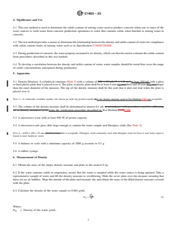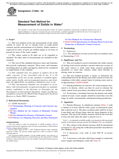 SIGNIFICANCE AND USE 4.1 This test method is used to determine the solids content of mixing water used to produce concrete when one or more of the water sources is wash water from concrete production operations or water that contains solids when batched as mixing water in concrete. 4.2 The test method provides a means to determine the relationship between the density and solids content of water for compliance with solids content limits of mixing water such as in Specification C1602/C1602M. 4.3 During production of concrete, the water property measured is its density, which can then be used to estimate the solids content from procedures described in this test method. 4.4 To develop a correlation between the density and solids content of water, water samples should be tested that cover the range of solids concentrations anticipated during production. SCOPE 1.1 This test method covers the measurement of the solids content in water for use as mixing water in ready-mixed concrete and the measurement of its density. Solids content is expressed in terms of parts per million (ppm) or in terms of percent by mass of the water sample. 1.2 The values stated in SI units are to be regarded as standard. No other units of measurement are included in this standard. 1.3 The text of this standard references notes and footnotes that provide explanatory material. These notes and footnotes (excluding those in tables and figures) shall not be considered as requirements of the standard. 1.4 This standard does not purport to address all of the safety concerns, if any, associated with its use. It is the responsibility of the user of this standard to establish appropriate safety, health, and environmental practices and determine the applicability of regulatory limitations prior to use. 1.5 This international standard was developed in accordance with internationally recognized principles on standardization established in the Decision on Principles for the Development of International Standards, Guides and Recommendations issued by the World Trade Organization Technical Barriers to Trade (TBT) Committee.