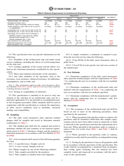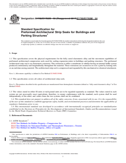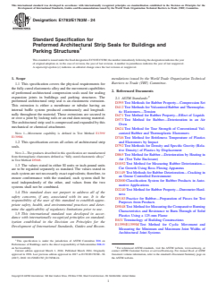 ASTM E1783/E1783M-24 is a technical specification published by ASTM International. Its full title is "Standard Specification for Preformed Architectural Strip Seals for Buildings and Parking Structures". This standard covers: ABSTRACT This specification covers the physical requirements and movement capabilities of preformed architectural strip seals for use in sealing expansion joints in buildings and parking structures. However, this specification does not provide information on the durability of the architectural strip seals under actual service conditions, loading capability of the system, and the effects of a load on the functional parameters. Material covered by this specification consists of architectural strip seals extruded as a membrane or tubular, with frames, with flanges mechanically or chemically secured, used in interior or exterior application, and used in any construction of the building. The architectural strip seal shall be manufactured from a fully cured elastomeric alloy as a preformed extrusion free of defects such as holes and air bubbles, and with dimensions conforming to the requirements specified. Tests for tensile strength, elongation at break, hardness, ozone resistance, compression set, heat aging, tear resistance, brittleness temperature, and water absorption shall be performed and shall conform to the requirements specified. SIGNIFICANCE AND USE 9.1 Architectural strip seals included in this specification shall be those: 9.1.1 Extruded as a membrane, 9.1.2 Extruded as tubular, 9.1.3 With frames, 9.1.4 With flanges mechanically secured, 9.1.5 With flanges chemically secured, 9.1.6 Used in interior or exterior applications, and 9.1.7 Used in any construction of the building. 9.2 This specification will give users, producers, building officials, code authorities, and others a basis for verifying material and performance characteristics of representative specimens under common test conditions. This specification will produce data on the following: 9.2.1 The physical properties of the fully cured elastomeric alloy, and 9.2.2 The movement capability in relation to the nominal joint width as defined under Test Method E1399/E1399M. 9.3 This specification compares similar architectural strip seals but is not intended to reflect the system's application. “Similar” refers to the same type of architectural strip seal within the same subsection under 9.1. 9.4 This specification does not provide information on the following: 9.4.1 Durability of the architectural strip seal under actual service conditions, including the effects of cycled temperature on the strip seal; 9.4.2 Loading capability of the system and the effects of a load on the functional parameters established by this specification; 9.4.3 Shear and rotational movements of the specimen; 9.4.4 Any other attributes of the specimen, such as fire resistance, wear resistance, chemical resistance, air infiltration, watertightness, and so forth; and Note 3: This specification addresses fully cured elastomeric alloys. Test Methods D395, D573, D1052, and D1149 are tests better suited for evaluating thermoset materials. 9.4.5 Testing or compatibility of substrates. 9.5 This specification is intended to be used as only one element in the selection of an architectural strip seal for a particular application. It is not... SCOPE 1.1 This specification covers the physical requirements for the fully cured elastomeric alloy and the movement capabilities of preformed architectural compression seals used for sealing expansion joints in buildings and parking structures. The preformed architectural strip seal is an elastomeric extrusion. This extrusion is either a membrane or tubular having an internal baffle system produced continuously and longitudinally throughout the material. These extrusions are secured in or over a joint by locking rails or an end dam nosing material. The architectural strip seal is compressed and expanded by this mechanical or chemical attachment. Note 1: Movement capability is defined in Test Method E1399/E1399M. 1.2 This specification covers all colors of architectural strip seals. No...