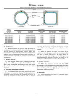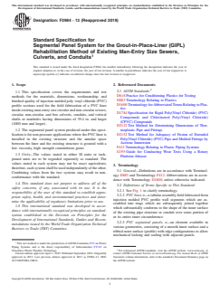 ASTM F2984-13(2019) is a technical specification published by ASTM International. Its full title is "Standard Specification for Segmental Panel System for the Grout-in-Place-Liner (GIPL) Rehabilitation Method of Existing Man-Entry Size Sewers, Culverts, and Conduits". This standard covers: ABSTRACT This specification establishes the requirements and test methods for the materials, dimensions, workmanship, and finished quality of injection molded polyvinyl chloride (PVC) profile sections used for the field fabrication of a PVC liner inside existing man-entry size circular and non-circular sewers; circular, non-circular, and box culverts, conduits, and vertical shafts or manholes having dimensions of 39.4 in. and larger (1000 mm and larger). It covers segmental panel system for non-pressure applications where the PVC liner is installed in the existing structure and the annular space between the liner and the existing structure is grouted with a low viscosity, high strength cementitious grout. SCOPE 1.1 This specification covers the requirements and test methods for the materials, dimensions, workmanship, and finished quality of injection molded poly vinyl chloride (PVC) profile sections used for the field fabrication of a PVC liner inside existing man-entry size circular and non-circular sewers; circular, non-circular, and box culverts, conduits, and vertical shafts or manholes having dimensions of 39.4 in. and larger (1000 mm and larger). 1.2 The segmental panel system produced under this specification is for non-pressure applications where the PVC liner is installed in the existing structure and the annular space between the liner and the existing structure is grouted with a low viscosity, high strength cementitious grout. 1.3 Units—The values stated in either SI units or inch-pound units are to be regarded separately as standard. The values stated in each system may not be exact equivalents; therefore, each system shall be used independently of the other. Combining values from the two systems may result in non-conformance with the standard. 1.4 This standard does not purport to address all of the safety concerns, if any, associated with its use. It is the responsibility of the user of this standard to establish appropriate safety, health, and environmental practices and determine the applicability of regulatory limitations prior to use. 1.5 This international standard was developed in accordance with internationally recognized principles on standardization established in the Decision on Principles for the Development of International Standards, Guides and Recommendations issued by the World Trade Organization Technical Barriers to Trade (TBT) Committee.