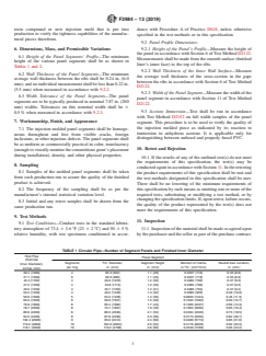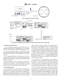 ABSTRACT This specification establishes the requirements and test methods for the materials, dimensions, workmanship, and finished quality of injection molded polyvinyl chloride (PVC) profile sections used for the field fabrication of a PVC liner inside existing man-entry size circular and non-circular sewers; circular, non-circular, and box culverts, conduits, and vertical shafts or manholes having dimensions of 39.4 in. and larger (1000 mm and larger). It covers segmental panel system for non-pressure applications where the PVC liner is installed in the existing structure and the annular space between the liner and the existing structure is grouted with a low viscosity, high strength cementitious grout. SCOPE 1.1 This specification covers the requirements and test methods for the materials, dimensions, workmanship, and finished quality of injection molded poly vinyl chloride (PVC) profile sections used for the field fabrication of a PVC liner inside existing man-entry size circular and non-circular sewers; circular, non-circular, and box culverts, conduits, and vertical shafts or manholes having dimensions of 39.4 in. and larger (1000 mm and larger). 1.2 The segmental panel system produced under this specification is for non-pressure applications where the PVC liner is installed in the existing structure and the annular space between the liner and the existing structure is grouted with a low viscosity, high strength cementitious grout. 1.3 Units—The values stated in either SI units or inch-pound units are to be regarded separately as standard. The values stated in each system may not be exact equivalents; therefore, each system shall be used independently of the other. Combining values from the two systems may result in non-conformance with the standard. 1.4 This standard does not purport to address all of the safety concerns, if any, associated with its use. It is the responsibility of the user of this standard to establish appropriate safety, health, and environmental practices and determine the applicability of regulatory limitations prior to use. 1.5 This international standard was developed in accordance with internationally recognized principles on standardization established in the Decision on Principles for the Development of International Standards, Guides and Recommendations issued by the World Trade Organization Technical Barriers to Trade (TBT) Committee.