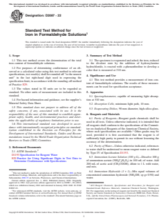 Keywords: ASTM D2087-22, iron in formaldehyde solutions, formaldehyde quality control, spectrophotometric analysis, iron measurement, chemical standards, ASTM International, specification acceptance, chemical test method, regulatory compliance, analytical chemistry.