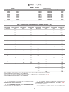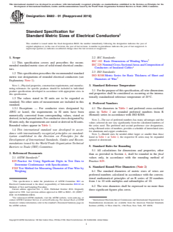ABSTRACT This specification prescribes the recommended standard metric sizes of solid round electrical conductors. The standard diameters of metric sizes of wires are preferred numbers calculated in accordance with the conventional mathematical principles. The standard metric size of stranded conductors and equivalent cross-sectional areas shall be designated. SCOPE 1.1 This specification covers and prescribes the recommended standard metric sizes of solid round electrical conductors. 1.2 This specification prescribes the recommended standard metric size designations of stranded electrical conductors (see Explanatory Note 1). Note 1: Physical properties, construction requirements, and manufacturing tolerances for specific products should be included in individual product specifications developed in accordance with appropriate sizes in this specification. 1.3 The values stated in SI units are to be regarded as standard. No other units of measurement are included in this standard. 1.3.1 Exceptions — For conductor sizes designated by AWG or kcmil, the requirements in SI units have been numerically converted from corresponding values, stated or derived, in inch-pound units. For conductor sizes designated by SI units only, the requirements are stated or derived in SI units. Rounded values appear in Table 1. (A) The inch diameters, square inch areas, and circular mil areas are rounded values calculated from the metric diameters.