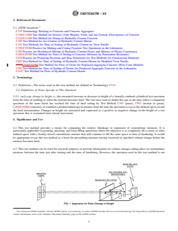 SIGNIFICANCE AND USE 4.1 This test method provides a means for comparing the relative shrinkage or expansion of cementitious mixtures. It is particularly applicable to grouting, patching, and form-filling operations where the objective is to completely fill a cavity or other defined space with a freshly mixed cementitious mixture that will continue to fill the same space at time of hardening. It would be appropriate to use this test method as a basis for prescribing mixtures having restricted or specified volume change before the mixture becomes hard. 4.2 This test method can be used for research purposes to provide information on volume changes taking place in cementitious mixtures between the time just after mixing and the time of hardening. However, the specimen used in this test method is not completely unrestrained so that the measurements are primarily useful for comparative purposes rather than as absolute values. Further, the degree of restraint to which the specimen is subjected varies with the viscosity and degree of hardening of the mixture. SCOPE 1.1 This test method covers the determination of change in height of cylindrical specimens from the time of molding until the mixture is hard. 1.2 This test method covers height change measurements at early ages for cementitious mixtures of paste, grout, mortar, and concrete. 1.3 This test method is intended for determination of changes in height that occur from the time of placement until the specimen is fully hard. These include shrinkage or expansion due to hydration, settlement, evaporation, and other physical and chemical effects. 1.4 The values stated in either SI units or inch-pound units are to be regarded separately as standard. The values stated in each system are not necessarily exact equivalents; therefore, to ensure conformance with the standard, each system shall be used independently of the other, and values from the two systems shall not be combined 1.5 The text of this test method refers to notes and footnotes that provide explanatory information. These notes and footnotes shall not be considered as requirements of the test method. 1.6 This standard does not purport to address all of the safety concerns, if any, associated with its use. It is the responsibility of the user of this standard to establish appropriate safety, health, and environmental practices and determine the applicability of regulatory limitations prior to use. (Warning—Fresh hydraulic cementitious mixtures are caustic and may cause chemical burns to exposed skin and tissue upon prolonged exposure.2) 1.7 This international standard was developed in accordance with internationally recognized principles on standardization established in the Decision on Principles for the Development of International Standards, Guides and Recommendations issued by the World Trade Organization Technical Barriers to Trade (TBT) Committee.