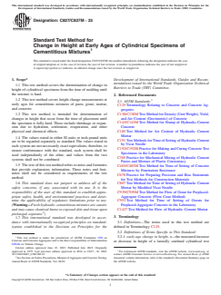 ASTM C827/C827M-23 is a standard published by ASTM International. Its full title is "Standard Test Method for Change in Height at Early Ages of Cylindrical Specimens of Cementitious Mixtures". This standard covers: SIGNIFICANCE AND USE 4.1 This test method provides a means for comparing the relative shrinkage or expansion of cementitious mixtures. It is particularly applicable to grouting, patching, and form-filling operations where the objective is to completely fill a cavity or other defined space with a freshly mixed cementitious mixture that will continue to fill the same space at time of hardening. It would be appropriate to use this test method as a basis for prescribing mixtures having restricted or specified volume change before the mixture becomes hard. 4.2 This test method can be used for research purposes to provide information on volume changes taking place in cementitious mixtures between the time just after mixing and the time of hardening. However, the specimen used in this test method is not completely unrestrained so that the measurements are primarily useful for comparative purposes rather than as absolute values. Further, the degree of restraint to which the specimen is subjected varies with the viscosity and degree of hardening of the mixture. SCOPE 1.1 This test method covers the determination of change in height of cylindrical specimens from the time of molding until the mixture is hard. 1.2 This test method covers height change measurements at early ages for cementitious mixtures of paste, grout, mortar, and concrete. 1.3 This test method is intended for determination of changes in height that occur from the time of placement until the specimen is fully hard. These include shrinkage or expansion due to hydration, settlement, evaporation, and other physical and chemical effects. 1.4 The values stated in either SI units or inch-pound units are to be regarded separately as standard. The values stated in each system are not necessarily exact equivalents; therefore, to ensure conformance with the standard, each system shall be used independently of the other, and values from the two systems shall not be combined 1.5 The text of this test method refers to notes and footnotes that provide explanatory information. These notes and footnotes shall not be considered as requirements of the test method. 1.6 This standard does not purport to address all of the safety concerns, if any, associated with its use. It is the responsibility of the user of this standard to establish appropriate safety, health, and environmental practices and determine the applicability of regulatory limitations prior to use. (Warning—Fresh hydraulic cementitious mixtures are caustic and may cause chemical burns to exposed skin and tissue upon prolonged exposure.2) 1.7 This international standard was developed in accordance with internationally recognized principles on standardization established in the Decision on Principles for the Development of International Standards, Guides and Recommendations issued by the World Trade Organization Technical Barriers to Trade (TBT) Committee.