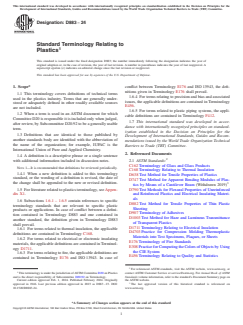 SCOPE 1.1 This terminology covers definitions of technical terms used in the plastics industry. Terms that are generally understood or adequately defined in other readily available sources are not included. 1.2 When a term is used in an ASTM document for which Committee D20 is responsible it is included only when judged, after review, by Subcommittee D20.92 to be a generally usable term. 1.3 Definitions that are identical to those published by another standards body are identified with the abbreviation of the name of the organization; for example, IUPAC is the International Union of Pure and Applied Chemistry. 1.4 A definition is a descriptive phrase or a single sentence with additional information included in discussion notes. Note 1: It is recommended that definitions be reviewed periodically. 1.4.1 When a new definition is added to this terminology standard, or the wording of a definition is revised, the date of the change shall be appended to the new or revised definition. 1.5 For literature related to plastics terminology, see Appendix X1. 1.6 Subsections 1.6.1 – 1.6.5 contain references to specific terminology standards that are relevant to specific plastic products or applications. In case of conflict between a definition contained in Terminology D883 and one contained in another standard, the definition given in Terminology D883 shall prevail. 1.6.1 For terms related to thermal insulation, the applicable definitions are contained in Terminology C168. 1.6.2 For terms related to electrical or electronic insulating materials, the applicable definitions are contained in Terminology D1711. 1.6.3 For terms relating to fire, the applicable definitions are contained in Terminology E176 and ISO 13943. In case of conflict between Terminology E176 and ISO 13943, the definitions given in Terminology E176 shall prevail. 1.6.4 For terms relating to precision and bias and associated issues, the applicable definitions are contained in Terminology E456. 1.6.5 For terms related to plastic piping systems, the applicable definitions are contained in Terminology F412. 1.7 This international standard was developed in accordance with internationally recognized principles on standardization established in the Decision on Principles for the Development of International Standards, Guides and Recommendations issued by the World Trade Organization Technical Barriers to Trade (TBT) Committee.