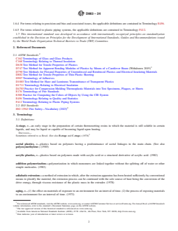 ASTM D883-24 is a standard published by ASTM International. Its full title is "Standard Terminology Relating to Plastics". This standard covers: SCOPE 1.1 This terminology covers definitions of technical terms used in the plastics industry. Terms that are generally understood or adequately defined in other readily available sources are not included. 1.2 When a term is used in an ASTM document for which Committee D20 is responsible it is included only when judged, after review, by Subcommittee D20.92 to be a generally usable term. 1.3 Definitions that are identical to those published by another standards body are identified with the abbreviation of the name of the organization; for example, IUPAC is the International Union of Pure and Applied Chemistry. 1.4 A definition is a descriptive phrase or a single sentence with additional information included in discussion notes. Note 1: It is recommended that definitions be reviewed periodically. 1.4.1 When a new definition is added to this terminology standard, or the wording of a definition is revised, the date of the change shall be appended to the new or revised definition. 1.5 For literature related to plastics terminology, see Appendix X1. 1.6 Subsections 1.6.1 – 1.6.5 contain references to specific terminology standards that are relevant to specific plastic products or applications. In case of conflict between a definition contained in Terminology D883 and one contained in another standard, the definition given in Terminology D883 shall prevail. 1.6.1 For terms related to thermal insulation, the applicable definitions are contained in Terminology C168. 1.6.2 For terms related to electrical or electronic insulating materials, the applicable definitions are contained in Terminology D1711. 1.6.3 For terms relating to fire, the applicable definitions are contained in Terminology E176 and ISO 13943. In case of conflict between Terminology E176 and ISO 13943, the definitions given in Terminology E176 shall prevail. 1.6.4 For terms relating to precision and bias and associated issues, the applicable definitions are contained in Terminology E456. 1.6.5 For terms related to plastic piping systems, the applicable definitions are contained in Terminology F412. 1.7 This international standard was developed in accordance with internationally recognized principles on standardization established in the Decision on Principles for the Development of International Standards, Guides and Recommendations issued by the World Trade Organization Technical Barriers to Trade (TBT) Committee.