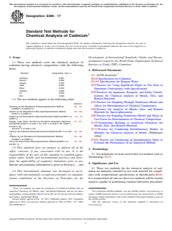 Keywords: ASTM E396-17, chemical analysis of cadmium, cadmium impurities, spectrophotometric analysis, trace metals, ASTM standards, cadmium quality control, laboratory testing, compositional specifications, metals analysis.