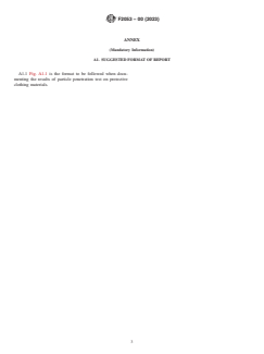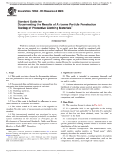 SIGNIFICANCE AND USE 2.1 This guide is intended to encourage thorough and consistent documentation of airborne particle penetration testing and its results. 2.2 Uniform information and performance data increase the likelihood of selecting proper particle protective clothing by direct comparison of one material with another. 2.3 A standard format for test information and data also encourages computer storage of test results for easy retrieval, comparison, and correlations. SCOPE 1.1 This guide provides a format for documenting information and performance data for an airborne particle penetration test. 1.2 Documented data and information are grouped into five categories that define important aspects of each test: 1.2.1 Description of material tested, 1.2.2 Challenge particles, 1.2.3 Test method, 1.2.4 Test results, and 1.2.5 Source of the data. 1.3 Use of this guide is facilitated by adherence to procedures outlined in a standard test method. 1.4 The values stated in SI units are to be regarded as standard. No other units of measurements are included in this standard. 1.5 This international standard was developed in accordance with internationally recognized principles on standardization established in the Decision on Principles for the Development of International Standards, Guides and Recommendations issued by the World Trade Organization Technical Barriers to Trade (TBT) Committee.