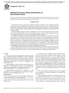 ASTM F589-23 is a technical specification published by ASTM International. Its full title is "Standard Consumer Safety Specification for Non-Powder Guns". This standard covers: SIGNIFICANCE AND USE 6.1 This consumer safety specification establishes performance requirements and test methods intended to provide a reasonable degree of safety in the normal use of non-powder guns and projectiles. 6.2 This consumer safety specification attempts to address the misuse of non-powder guns and specifies the minimum warnings and instructions that are to be provided in literature and on labels and packages. SCOPE 1.1 This consumer safety specification covers non-powder guns, commonly referred to as BB guns, air guns, and pellet guns, which propel a projectile by means of energy released by compressed air, compressed gas, mechanical spring action, or a combination thereof, and is to be used in conjunction with Specification F590. 1.2 Special-purpose match precision and adult guns, as defined in 3.1 and classified in 8.1 and 8.2, are exempt from the performance requirements for trigger mechanisms (see 4.3), safety mechanisms (see 4.4), and drop tests (see 4.5). 1.3 Special-purpose training guns, as defined in 3.1 and classified in 8.3, are exempt from the performance requirements for the safety mechanism (see 4.4). 1.4 Limitations—This consumer safety specification does not cover the following categories of gun products: custom-made non-powder guns (see 3.1.2.6); or replica guns (see 3.1.2.15); tranquilizer dart guns; toy products such as rubber-band guns, cork guns, pop guns, rubber-tip dart guns, or pea and bean shooters; other recreational-type guns such as blow guns, spear guns, catapult guns (also identified as sling shots), bows, crossbows, paintball markers, air soft or soft air guns, or carbide guns; nonrecreational guns such as those used by law enforcement, scientific, or military agencies; nor industrial and consumer tools such as paintball guns, staple guns, or conduit guns. 1.5 The values stated in inch-pound units are to be regarded as the standard; the SI units in parentheses are provided for information only. 1.6 The following precautionary caveat pertains only to the test method portion, Section 9, of this specification: This standard does not purport to address all of the safety concerns, if any, associated with its use. It is the responsibility of the user of this standard to establish appropriate safety, health and environmental practices and determine the applicability of regulatory limitations prior to use. 1.7 This international standard was developed in accordance with internationally recognized principles on standardization established in the Decision on Principles for the Development of International Standards, Guides and Recommendations issued by the World Trade Organization Technical Barriers to Trade (TBT) Committee.