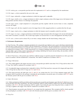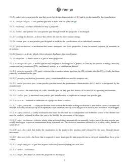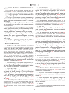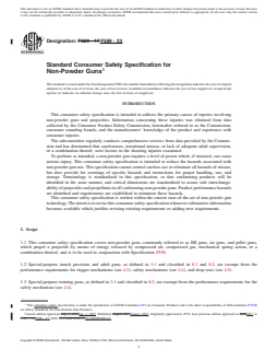 SIGNIFICANCE AND USE 6.1 This consumer safety specification establishes performance requirements and test methods intended to provide a reasonable degree of safety in the normal use of non-powder guns and projectiles. 6.2 This consumer safety specification attempts to address the misuse of non-powder guns and specifies the minimum warnings and instructions that are to be provided in literature and on labels and packages. SCOPE 1.1 This consumer safety specification covers non-powder guns, commonly referred to as BB guns, air guns, and pellet guns, which propel a projectile by means of energy released by compressed air, compressed gas, mechanical spring action, or a combination thereof, and is to be used in conjunction with Specification F590. 1.2 Special-purpose match precision and adult guns, as defined in 3.1 and classified in 8.1 and 8.2, are exempt from the performance requirements for trigger mechanisms (see 4.3), safety mechanisms (see 4.4), and drop tests (see 4.5). 1.3 Special-purpose training guns, as defined in 3.1 and classified in 8.3, are exempt from the performance requirements for the safety mechanism (see 4.4). 1.4 Limitations—This consumer safety specification does not cover the following categories of gun products: custom-made non-powder guns (see 3.1.2.6); or replica guns (see 3.1.2.15); tranquilizer dart guns; toy products such as rubber-band guns, cork guns, pop guns, rubber-tip dart guns, or pea and bean shooters; other recreational-type guns such as blow guns, spear guns, catapult guns (also identified as sling shots), bows, crossbows, paintball markers, air soft or soft air guns, or carbide guns; nonrecreational guns such as those used by law enforcement, scientific, or military agencies; nor industrial and consumer tools such as paintball guns, staple guns, or conduit guns. 1.5 The values stated in inch-pound units are to be regarded as the standard; the SI units in parentheses are provided for information only. 1.6 The following precautionary caveat pertains only to the test method portion, Section 9, of this specification: This standard does not purport to address all of the safety concerns, if any, associated with its use. It is the responsibility of the user of this standard to establish appropriate safety, health and environmental practices and determine the applicability of regulatory limitations prior to use. 1.7 This international standard was developed in accordance with internationally recognized principles on standardization established in the Decision on Principles for the Development of International Standards, Guides and Recommendations issued by the World Trade Organization Technical Barriers to Trade (TBT) Committee.