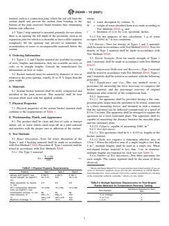 ABSTRACT This specification covers backer material, either in rod or strip form, for use with cold- and hot-applied joint sealant in portland-cement concrete or asphalt-pavement joints. Sealant backer material is available in three types: Type I, Type II, and Type III, and serves one or more of the following purposes: (1) limits the amount and depth of sealant applied to a joint, (2) acts as a barrier interface to prevent backside adhesion (bondbreaker), and (3) provides a form to assist the sealant in developing a shape factor. The material shall be easily compressed and installed in the joint reservoir and shall be heat resistant when used with hot-applied sealants. Physical properties of the material shall conform to the specified requirements for (1) density, (2) tensile strength, (3) water absorption, (3) compression deflection force, (4) compression recovery, (5) heat resistance, and (6) maximum shrinkage. The test specimen, test procedure, apparatus, and calculations for the physical properties enumerated are detailed. SCOPE 1.1 This specification covers backer material for cold- and hot-applied joint sealant for use in portland cement concrete or asphalt pavement joints. 1.2 This specification establishes basic requirements for sealant backer material, either in rod or strip form, that can withstand the temperature of hot- or cold-applied sealants without excessive deformation. 1.3 Sealant backer material serves one or more of the following purposes: 1.3.1 Limits the amount and depth of sealant applied to a joint, 1.3.2 Acts as a barrier interface to prevent backside adhesion (bond breaker), and 1.3.3 Provides a form to assist the sealant in developing a shape factor. 1.4 The values stated in inch-pound units are to be regarded as the standard. The values in parentheses are for information purposes only. 1.5 The following safety hazards caveat pertains only to the test methods described in this specification. This standard does not purport to address all of the safety concerns, if any, associated with its use. It is the responsibility of the user of this standard to establish appropriate safety, health, and environmental practices and determine the applicability of regulatory limitations prior to use. 1.6 This international standard was developed in accordance with internationally recognized principles on standardization established in the Decision on Principles for the Development of International Standards, Guides and Recommendations issued by the World Trade Organization Technical Barriers to Trade (TBT) Committee.