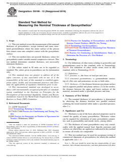• Nominal Thickness Measurement: The standard outlines the procedure for measuring the nominal thickness of geosynthetics using a specified instrument, pressure, and specimen conditioning.