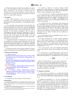 SIGNIFICANCE AND USE 6.1 Sensory thresholds are used to determine the potential of substances at low concentrations to impart odor, taste, skinfeel, etc. to some form of matter. 6.2 Thresholds are used, for example, in setting limits in air pollution, in noise abatement, in water treatment, and in food systems. 6.3 Thresholds are used to characterize and compare the sensitivity of individuals or groups to given stimuli, for example, in medicine, ethnic studies, and the study of animal species. SCOPE 1.1 The definitions and procedures of this practice apply to the calculation of individual thresholds for any stimulus in any medium, from data sets of intermediate size, that is, consisting of more than 20 to 40 3-AFC presentations per individual. A group threshold may be calculated using 5 to 15 individual thresholds. 1.2 This standard does not purport to address all of the safety concerns, if any, associated with its use. It is the responsibility of the user of this standard to establish appropriate safety, health, and environmental practices and determine the applicability of regulatory limitations prior to use. 1.3 This international standard was developed in accordance with internationally recognized principles on standardization established in the Decision on Principles for the Development of International Standards, Guides and Recommendations issued by the World Trade Organization Technical Barriers to Trade (TBT) Committee.