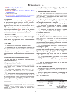 - Referenced Documents and Standards: Includes references to other ASTM standards, AATCC methods, and military standards such as MIL-STD-810G.