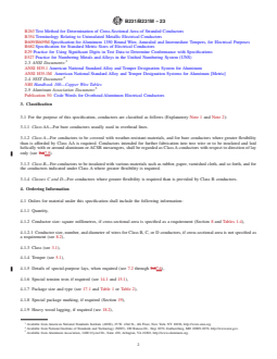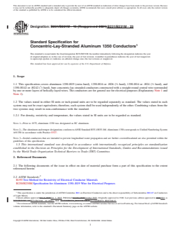ABSTRACT This specification covers aluminum 1350-H19, 1350-H16 or -H26, 1350-H14 or -H24, and 1350-H142 or -H242, bare concentric-lay-stranded conductors constructed with a straight round central wire surrounded by one or more layers of helically layered wires. Conductors are classified as Class AA for bare conductors usually used in overhead lines; Class A for conductors to be covered with weather resistant materials, and for bare conductors where greater flexibility than is afforded by Class AA is required; Class B for conductors to be insulated with various materials such as rubber, paper, varnished cloth, and so forth, and for the conductors indicated under Class A where greater flexibility is required; and Classes C and D for conductors where greater flexibility is required than is provided by Class B conductors. Aluminum wire employed in Classes AA and A conductors shall be 1350-H19, unless otherwise specified. The temper of conductors of Classes B, C and D shall be designated. The direction of lay of the outer layer shall be right-hand for Classes AA and A and left-hand for other classes. The various classes of concentric-lay-stranded conductors shall conform to the required areas of cross section, numbers, and diameters of wires. The rated strength of 1350-H19 conductors shall be taken as the percent of the sum of the strengths of the component wires, calculated using the nominal wire diameters and the specified minimum average tensile strength given in Specification B 230/B 230M for 1350-H19 wire. SCOPE 1.1 This specification covers aluminum 1350-H19 (extra hard), 1350-H16 or -H26 (3/4 hard), 1350-H14 or -H24 (1/2 hard), and 1350-H142 or -H242 (1/2 hard), bare concentric-lay-stranded conductors constructed with a straight round central wire surrounded by one or more layers of helically layed wires. The conductors are for general use for electrical purposes (Explanatory Note 1 and Note 2). 1.2 The values stated in either SI units or inch-pound units are to be regarded separately as standard. The values stated in each system may not be exact equivalents; therefore, each system shall be used independently of the other. Combining values from the two systems may result in non-conformance with the standard. 1.2.1 For density, resistivity and temperature, the values stated in SI units are to be regarded as standard. Note 1: Prior to 1975, aluminum 1350 was designated as EC aluminum. Note 2: The aluminum and temper designations conform to ANSI Standard H35.1/H35.1M. Aluminum 1350 corresponds to Unified Numbering System A91350 in accordance with Practice E527. Note 3: Sealed conductors that are intended to prevent longitudinal water propagation and are further covered/insulated are also permitted within the guidelines of this specification. 1.3 This international standard was developed in accordance with internationally recognized principles on standardization established in the Decision on Principles for the Development of International Standards, Guides and Recommendations issued by the World Trade Organization Technical Barriers to Trade (TBT) Committee.