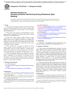 SIGNIFICANCE AND USE 5.1 The AE produced during the production of a spot-weld can be related to weld quality parameters such as the strength and size of the nugget, the amount of expulsion, and the amount of cracking. Therefore, in-process AE monitoring can be used both as an examination method, and as a means for providing feedback control. SCOPE 1.1 This practice describes procedures for the measurement, processing, and interpretation of the acoustic emission (AE) response associated with selected stages of the resistance spot-welding process. 1.2 This practice also provides recommendations for feedback control by utilizing the measured AE response signals during the spot-welding process. 1.3 Units—The values stated in either SI units or inch-pound units are to be regarded separately as standard. The values stated in each system may not be exact equivalents; therefore, each system shall be used independently of the other. Combining values from the two systems may result in non-conformance with the standard. 1.4 This standard does not purport to address all of the safety concerns, if any, associated with its use. It is the responsibility of the user of this standard to establish appropriate safety, health, and environmental practices and determine the applicability of regulatory limitations prior to use. 1.5 This international standard was developed in accordance with internationally recognized principles on standardization established in the Decision on Principles for the Development of International Standards, Guides and Recommendations issued by the World Trade Organization Technical Barriers to Trade (TBT) Committee.